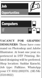 Tagged as: Computer Staff Vacancies 2025, DTF Printing Jobs in Pakistan, Graphic Designer Jobs in Karachi 2025, IT Jobs in Karachi 2025, The News Classified Jobs 2025